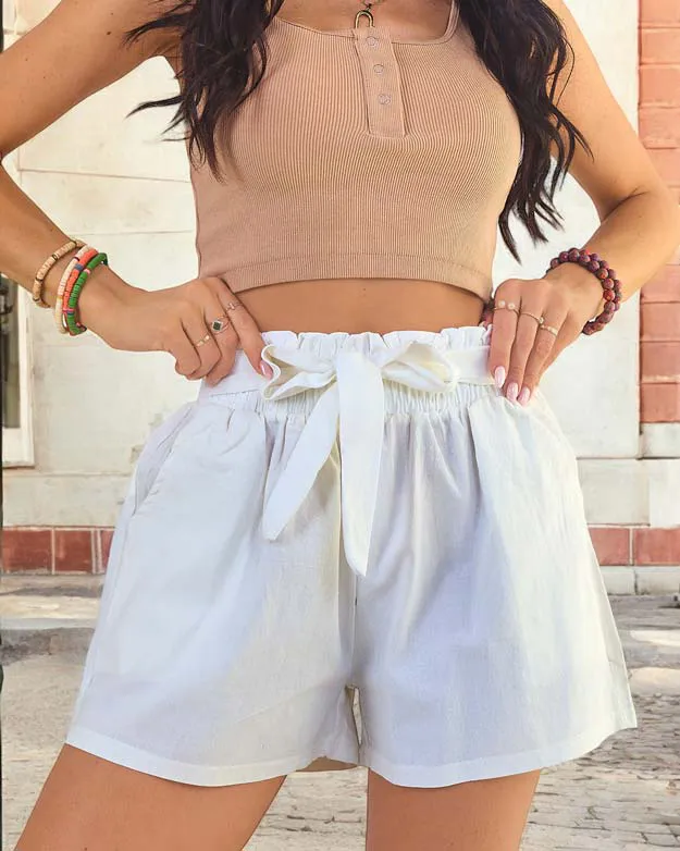 - Leichte Shorts aus Stoff für Damen. Modell mit hoher Taille, zwei Taschen und Gummizug und Hose in der Taille. Eine ideale Wahl für den Sommer! HINWEIS: Messgenauigkeit (+/-) 1 cm.
