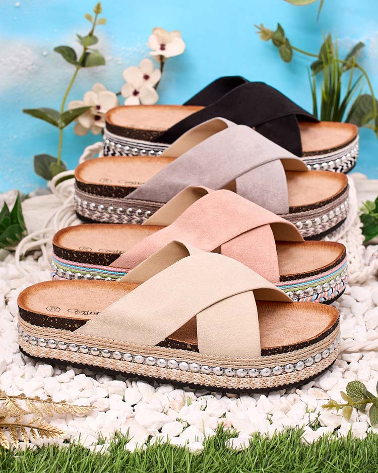 - Tolle Damen-Flip-Flops mit flacher Sohle. Ganz aus Öko-Wildleder hergestellt. Die Sohle ist mit Material a'la Kork verziert. Eine perfekte Wahl für die Ferien!