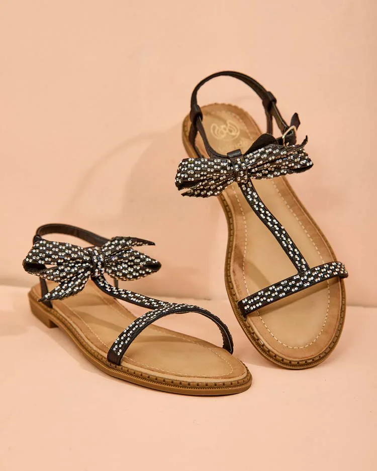 - Modische flache Damen Sandalen, komplett aus Öko-Leder hergestellt. Sie werden mit einer Schnalle geschlossen und das Oberteil ist mit einer dezenten Schleife verziert, die ihnen Raffinesse verleiht. Perfekt für sommerliche Spaziergänge und besondere Anlä