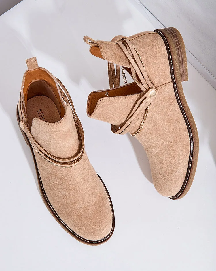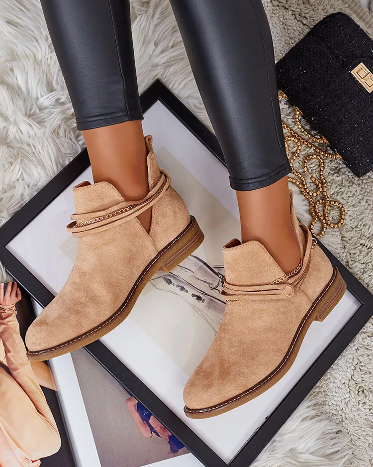 - Stylische Damenstiefel aus Öko-Wildleder mit Innensohle aus Naturleder sind ideal für kältere Tage. Modell zum Hineinschlüpfen mit dekorativen Ketten auf dem Schaft. Die Schuhe haben einen flachen Absatz und eine runde Spitze. Super Ergänzung zu Ihren läs