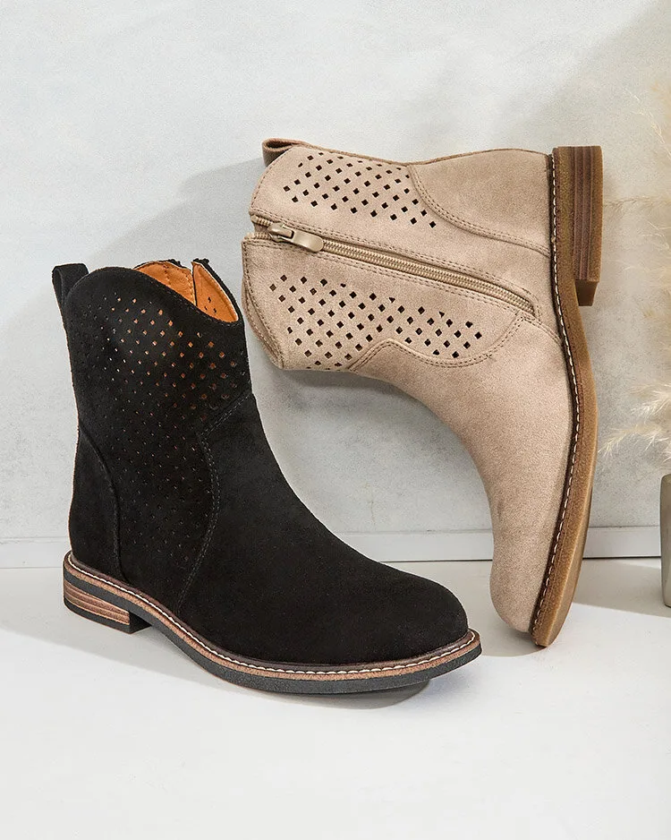 - Stylische Damenstiefel aus Öko-Wildleder mit Innensohle aus Naturleder sind ideal für kältere Tage. Der durchbrochene Schaft wird mit einem Reißverschluss verschlossen. Das Modell hat einen flachen Absatz und eine runde Nase. Super Ergänzung zu deinen läs