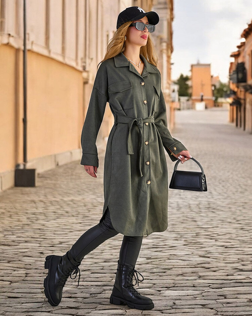 - Stilvoller Damen-Hemdenmantel mit Gürtel. Übergröße geschnittener Mantel hat lange Ärmel und Knopfverschluss. Modell mit 4 Taschen. Toll für den Herbst!