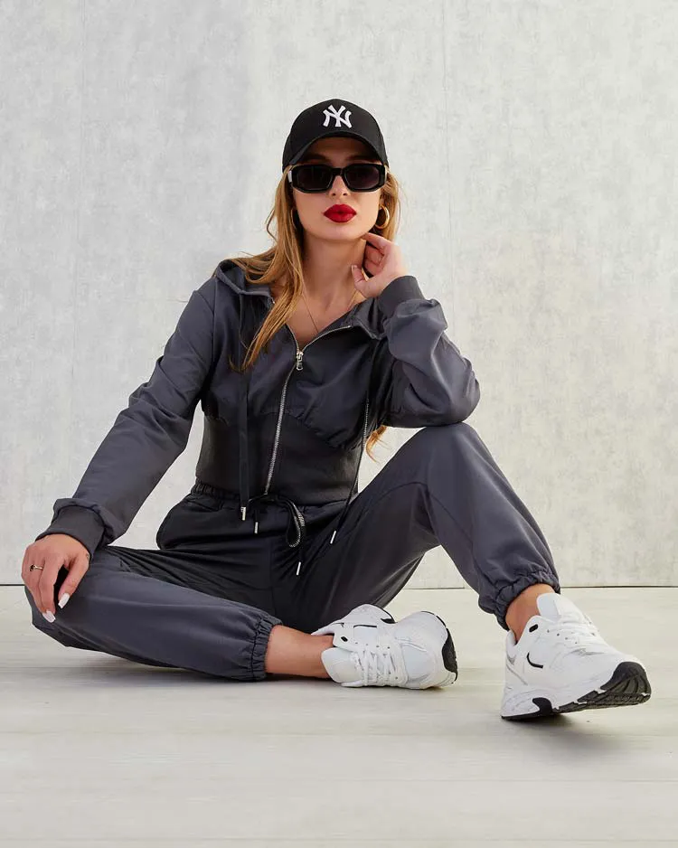 - Damen-Sweatshirt-Set aus angenehmem Stoff. Sweatshirt mit Reißverschluss und Kapuze und Hose mit elastischem Bund mit Hose und 2 Taschen. Die Hose ist mit Zirkonen verziert. HINWEIS: Messgenauigkeit (+/-) 1 cm.