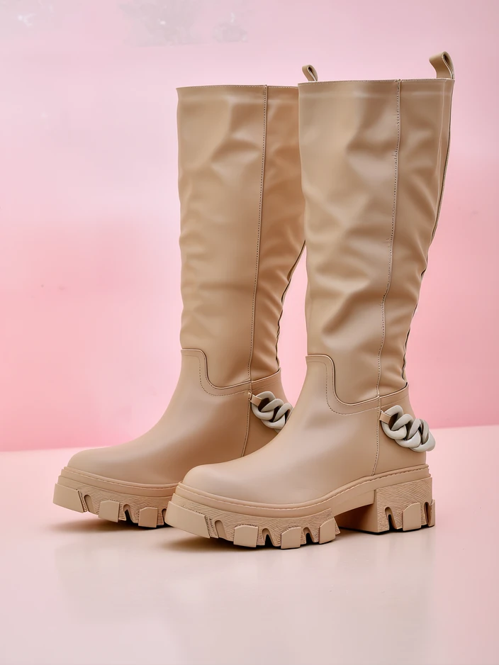 - Kniehohe Damenstiefel aus ökologischem Leder. Das Modell ist auf einem flachen Absatz. Das Schuhwerk ist zum Hineinschlüpfen. Sie haben eine nicht abnehmbare Dekoration auf der Rückseite in Form einer Kette.