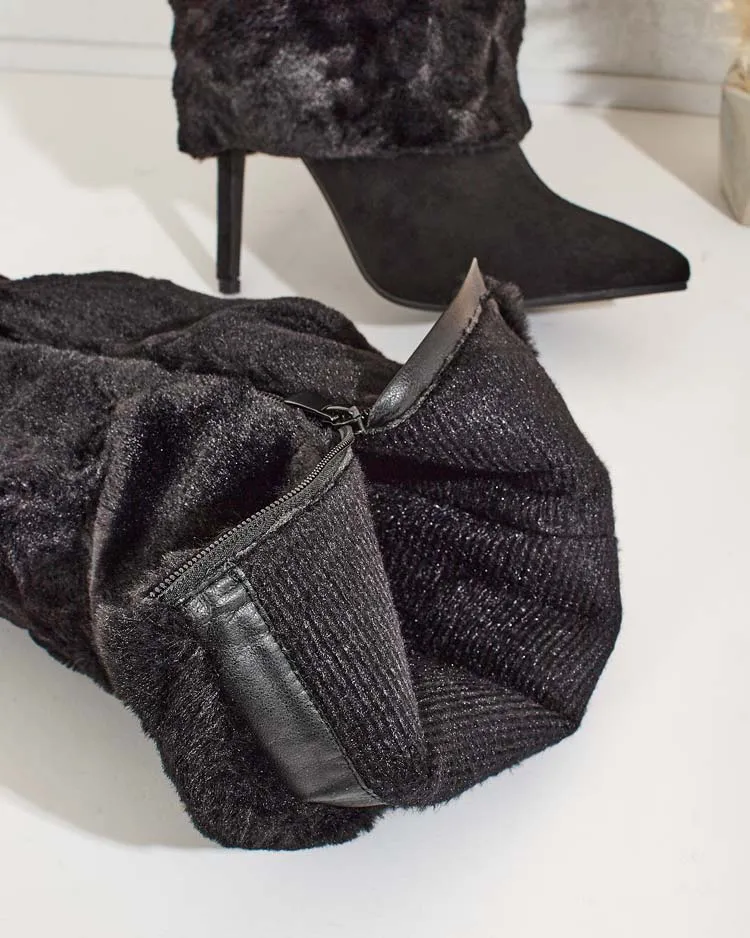 • Damenstiefel mit Stilettoabsatz und spitzer Schuhspitze. Aus ökologischem Veloursleder, außen mit einer zusätzlichen Schicht a'la Pelz überzogen, innen zart wärmend. Das Modell wird mit einem Reißverschluss geschlossen. Eine ideale Wahl für das Winterstyl