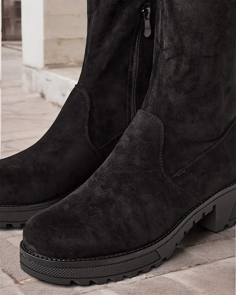 - Lange Damenstiefel mit dickerer Sohle, Schaft aus Öko-Wildleder. Die Stiefel haben einen Reißverschluss auf Knöchelhöhe. Perfekte Basis für viele Herbstoutfits!