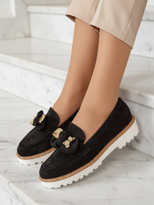 - Klassische Damen-Mokassins auf einer kleinen Plattform. Das Modell ist aus ökologischem Wildleder und einer Innensohle aus Öko-Leder gefertigt. Die Spitze ist mit einer Schleife verziert. Ein Must-have im Kleiderschrank jeder Frau!