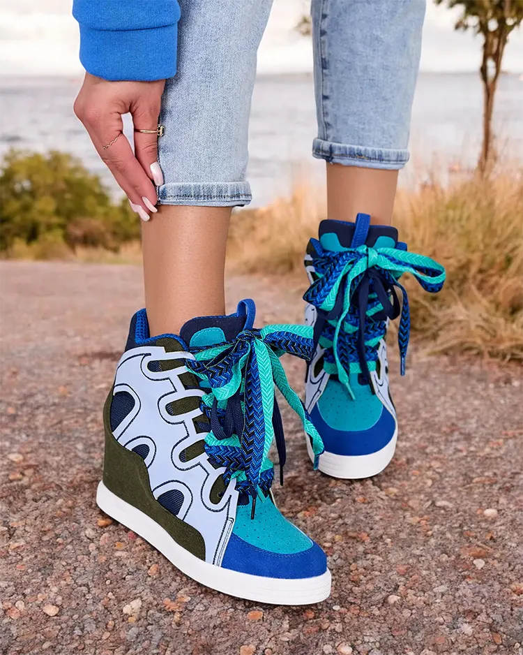 - Sportliche Damenstiefel auf Absätzen, aus einer Kombination von Öko-Leder und Öko-Wildleder. Schuhe mit dekorativen Schnürsenkeln gebunden, Innensohle aus Ökoleder.