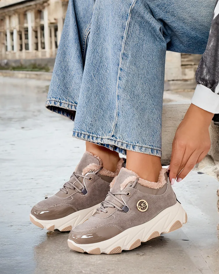 - Damen isolierte Sneaker Sportschuhe auf einer dickeren Sohle. Obermaterial zum Schnüren aus Bio-Wildleder. Innen weiches Fell. Super Ergänzung zu Ihren winterlichen Freizeitoutfits!