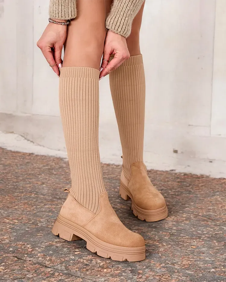 - Stilvolle kniehohe Damenstiefel mit flachem Absatz. Obermaterial aus elastischem Stoff kombiniert mit Öko-Wildleder, Innensohle aus Pelz. Modell zum Hineinschlüpfen. Perfekt für das tägliche Herbstoutfit!