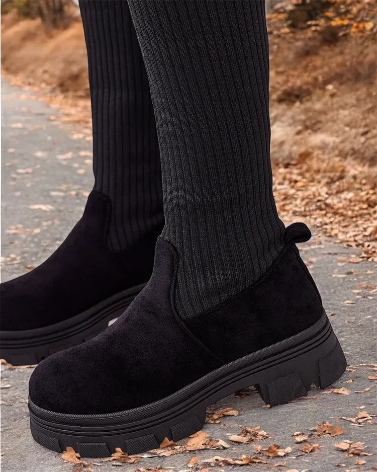 - Stilvolle kniehohe Damenstiefel mit flachem Absatz. Obermaterial aus elastischem Stoff kombiniert mit Öko-Wildleder, Innensohle aus Pelz. Modell zum Hineinschlüpfen. Perfekt für das tägliche Herbstoutfit!