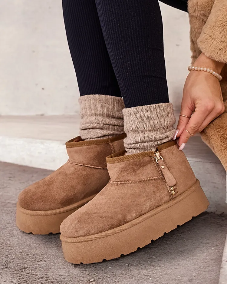 • Toller Damen Winter Plateau-Schneestiefel. Der Schaft ist aus Bio-Wildleder, die Mitte ist mit Fell isoliert. Das Modell hat einen dekorativen Reißverschluss. Ideale Basis für den Winter!