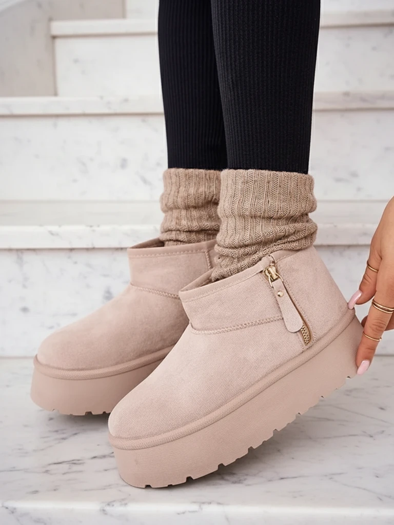• Toller Damen Winter Plateau-Schneestiefel. Der Schaft ist aus Bio-Wildleder, die Mitte ist mit Fell isoliert. Das Modell hat einen dekorativen Reißverschluss. Ideale Basis für den Winter!