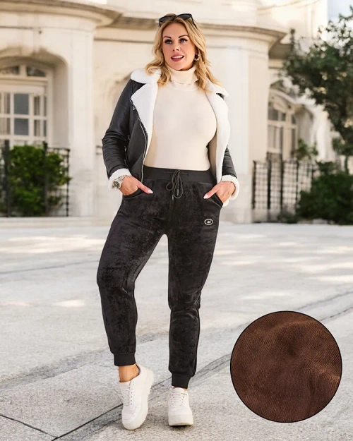 - Warme Damen-Sweatpants aus weichem Velours-Material. Ein Modell mit einfacher Schnittführung, hat zwei aufgesetzte Taschen und einen elastischen Bund mit Kordelzug. Innen gefüttert mit warmem Polarfleece. Perfekte Wahl für den täglichen Gebrauch!