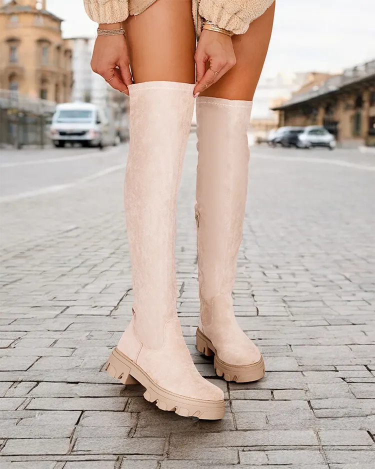 - Stilvolle flache Kniehohe Stiefel für Damen. Das Obermaterial besteht aus Kunst-Wildleder, mit einem Stoff-Innensohle innen. Slip-On-Modell mit einem halbhohen Reißverschluss. Perfekt für den täglichen Herbst-Look!