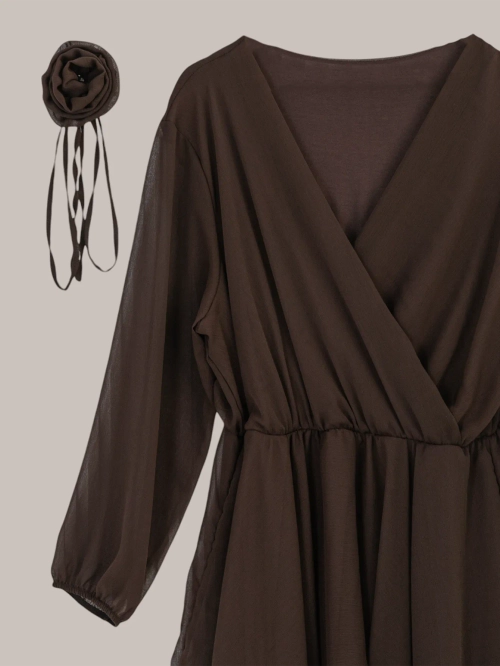 - Elegantes, zeitloses knielanges Damenkleid mit Wickelausschnitt und elastischem Bund. Das Kleid hat lange Ärmel aus Netzstoff und eine dekorative zusätzliche Schleife mit Blume. Tolle Wahl für einen Abend!