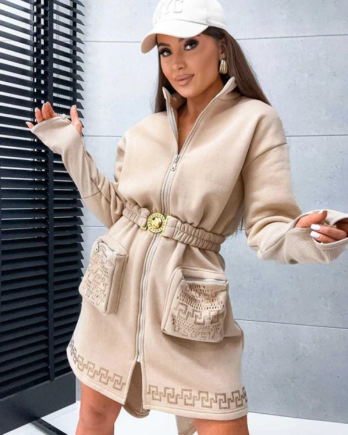 - Eine sehr stilvolle lange Damenbluse im Stil eines Kleides, aus angenehmem Material gefertigt. Das Modell hat lange Ärmel, einen asymmetrischen Saum und Paillettenverzierung. Zusätzlich ist ein Gürtel enthalten. Messgenauigkeit (+/-) 1 cm.