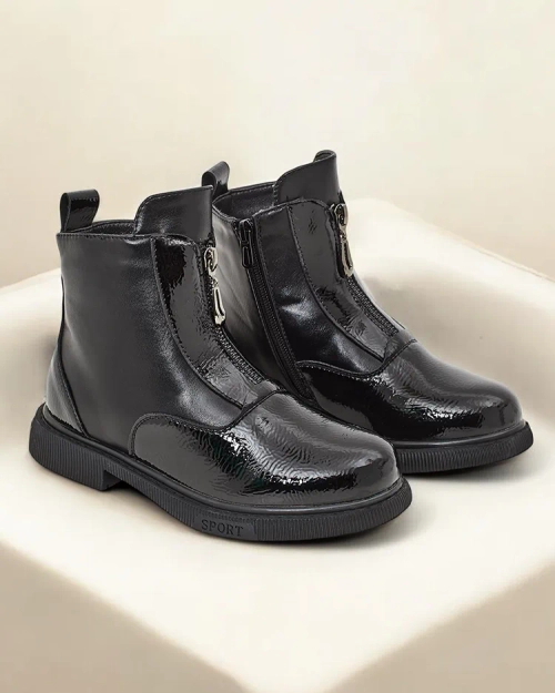 - Fabelhafte flache Mädchenstiefel aus einer Kombination aus Öko-Leder und Lack-Öko-Leder. Das Innere des Stiefels ist mit einem weichen, bequemen Pelz gefüttert. Mit einem Reißverschluss verschlossen.