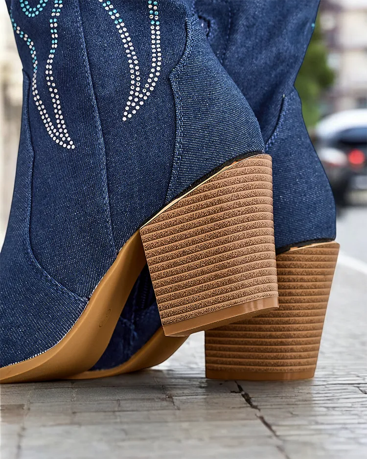 • Cowboystiefel mit Absätzen im Westernstil, aus Wildleder-ähnlichem Kunstleder gefertigt. Eco-Leder-Innensohle, Schuhe mit Reißverschluss verschlossen, Schaft mit Strasssteinen verziert. Sie passen zu vielen femininen Stilen!