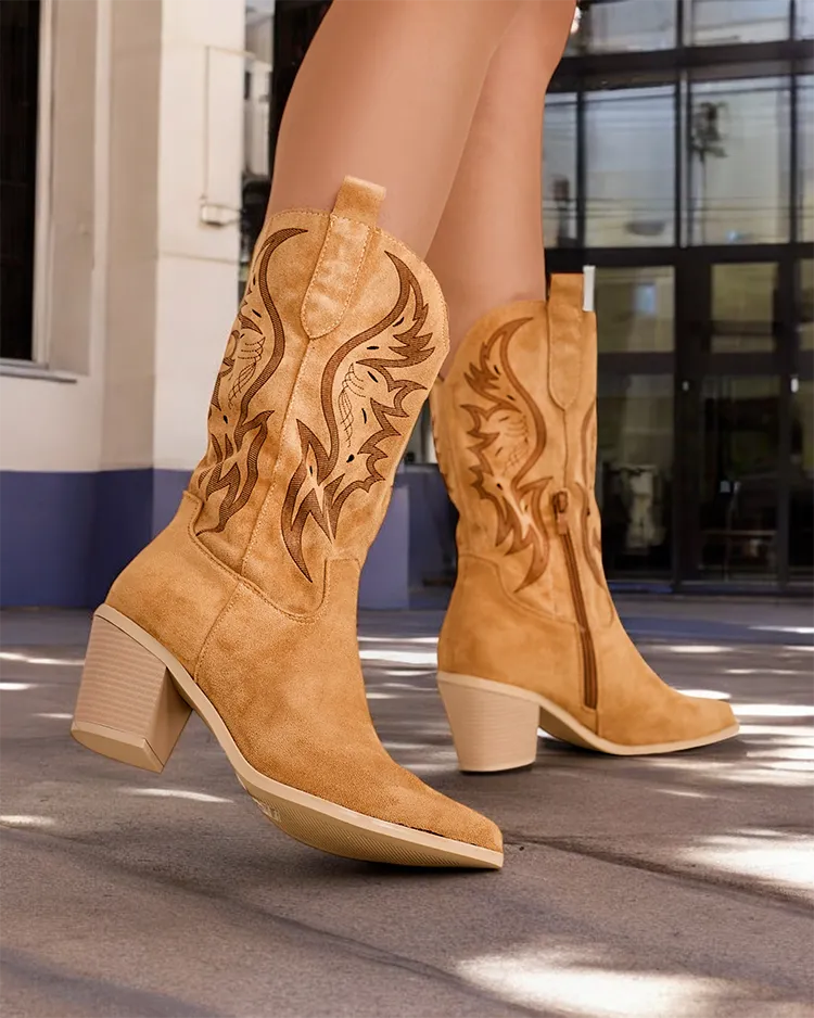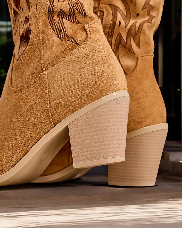 - Stiefel im Cowboy-Stil mit Absatz, hergestellt aus kunstleder. Eco-Leder-Innensohle, Schuhe mit Reißverschluss verschlossen, verziert mit Prägung. Sie passen zu vielen weiblichen Stylings!