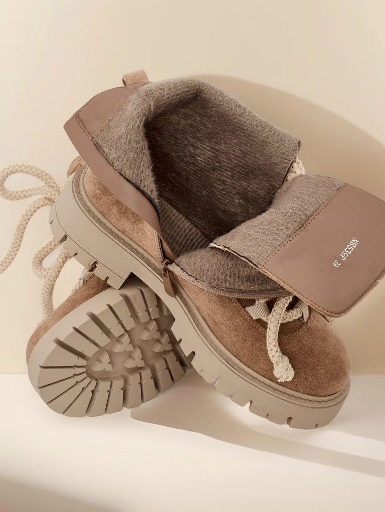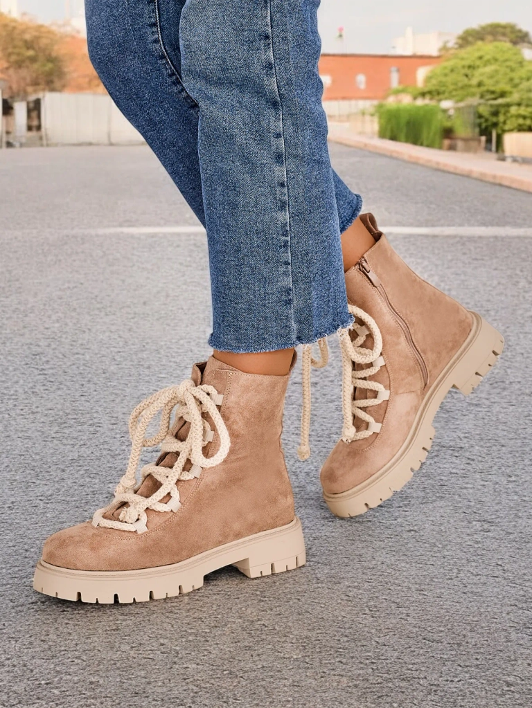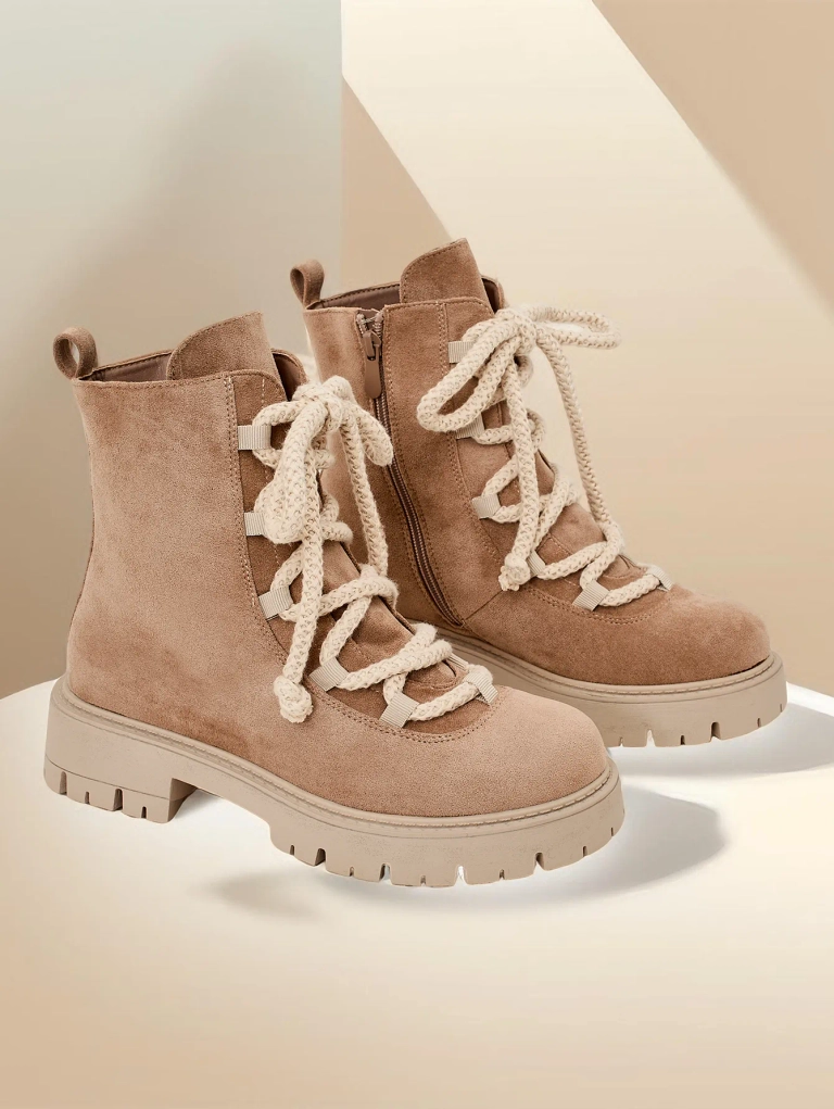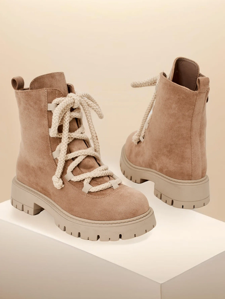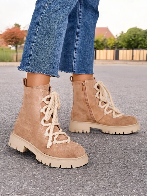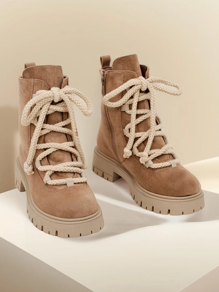 - Stylische Schnürstiefeletten aus Kunstwildleder. Die Schuhe werden geschnürt und mit einem Reißverschluss geschlossen. Das Modell hat eine dickere Sohle und ein kuscheliges Fellfutter. Perfekt für den Herbst!