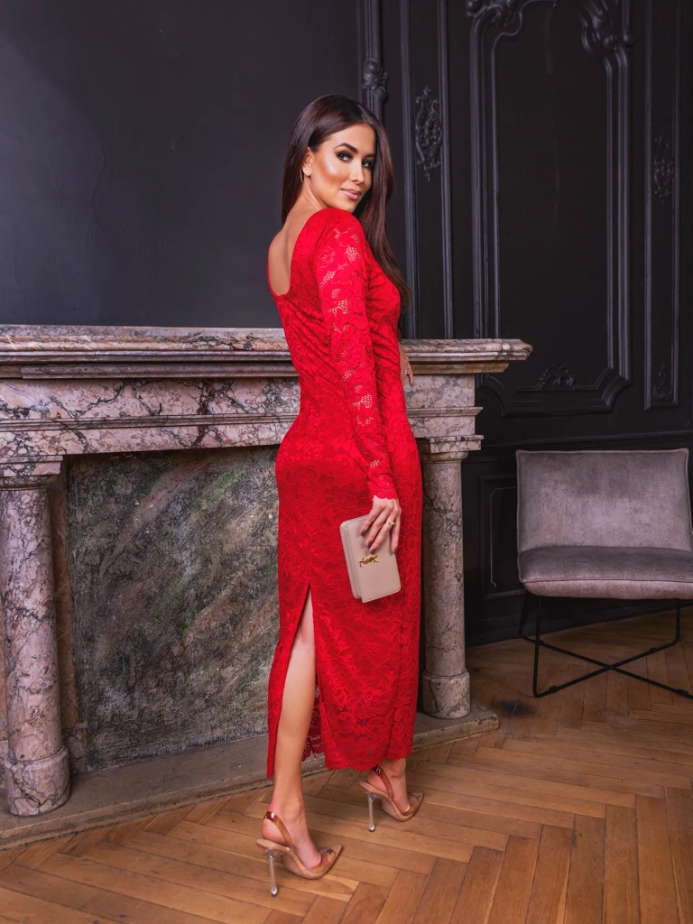 - Einzigartiges Damen-Midi-Kleid aus Spitzenstoff. Das Modell mit Rundhalsausschnitt hat lange Ärmel und ein Futter. Verziert mit Raffungen und mit einem Reißverschluss verschließbar. Perfekt für die Erstellung stilvoller Outfits! Messgenauigkeit (+/-) 1 cm