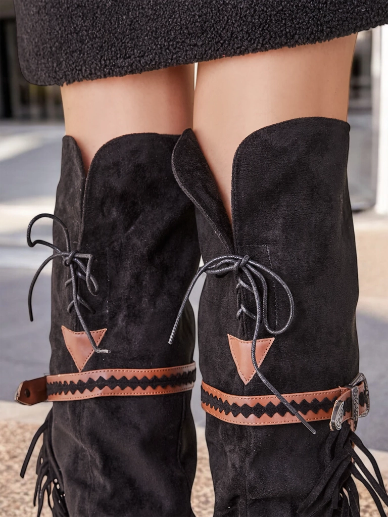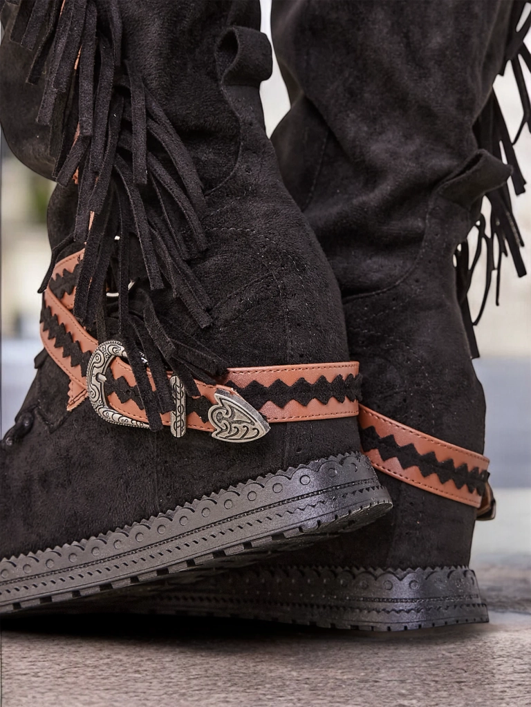 - Stilvolle Overknee-Damenstiefel mit verstecktem Keilabsatz. Das Obermaterial besteht aus ökologischem Wildleder. Stofffutter. Schlupfmodell, verziert mit Fransen und geprägten Riemen.