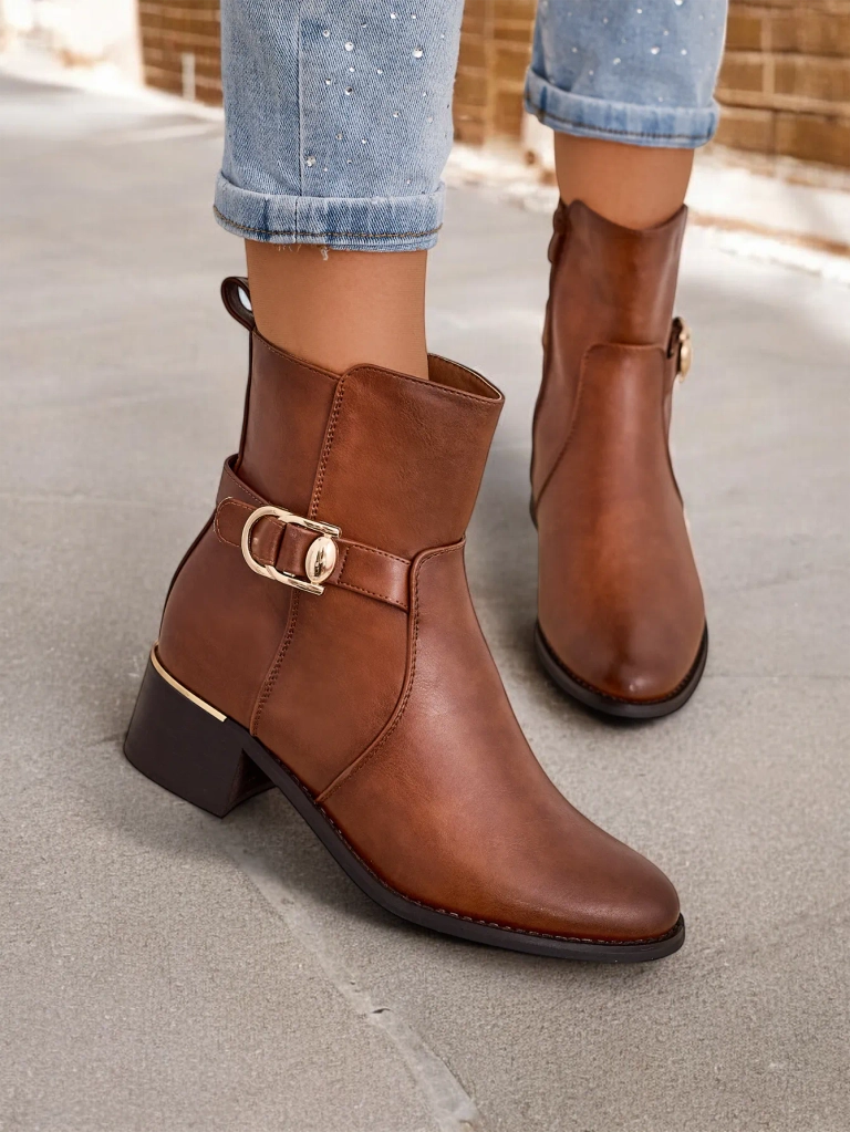 - Herrliche Damen-Stiefeletten mit niedrigem Absatz aus Kunstleder. Das Innenfutter besteht aus zartem Fell. Das Modell wird mit einem Reißverschluss geschlossen und hat eine verzierte Oberseite. Perfekt für Herbstoutfits!
