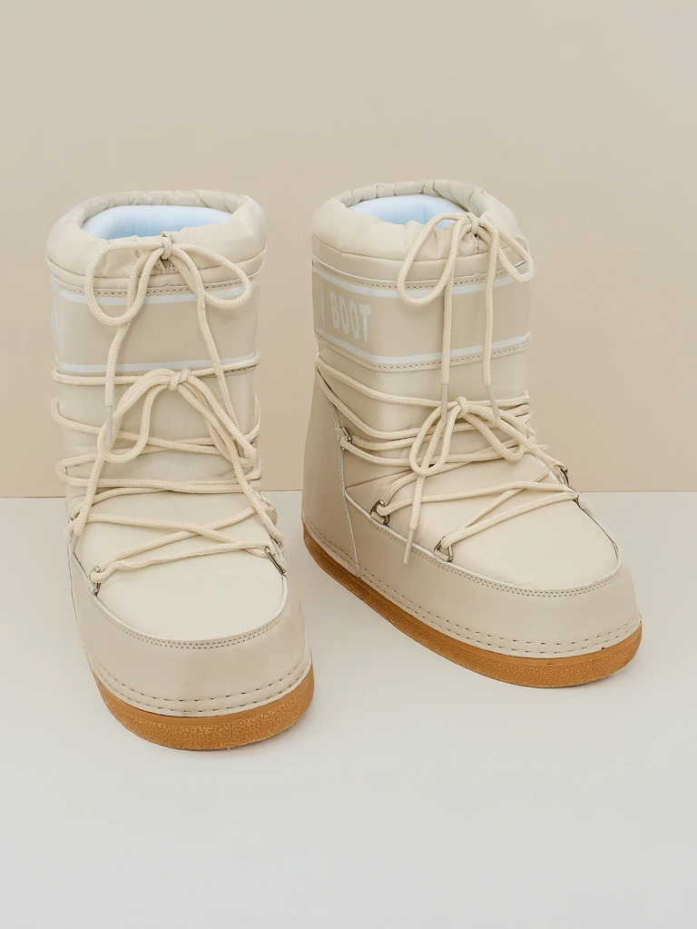 - Damen Schneestiefel mit Bündchen, hergestellt aus einer Kombination von Kunstleder und gestepptem Stoffmaterial. Gefüttert mit Stoff im Inneren, zum Hineinschlüpfen und Binden, mit Bündchen.