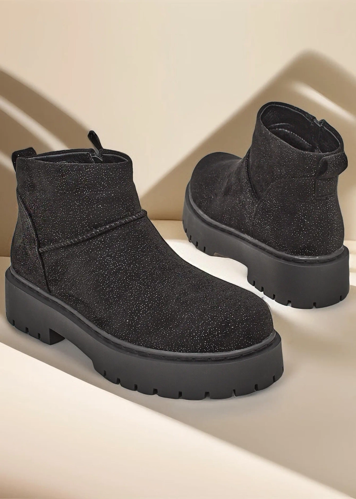 - Tolle Winter-Schneestiefel für Damen auf einer Plattform. Das Obermaterial besteht aus Öko-Wildleder mit eingearbeitetem Glitzerfaden, das Innere ist mit einem gemütlichen Pelz gefüttert. Perfekte Basis für den Winter!