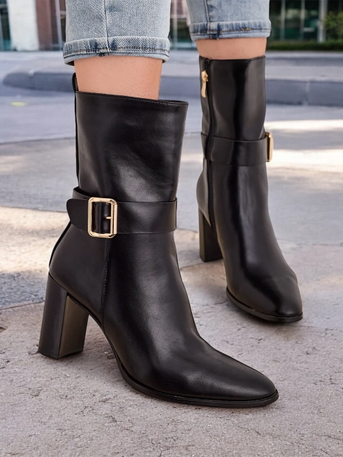 - Frauen Stiefeletten sind die perfekte Lösung für kältere Tage. Das Obermaterial aus Eco-Leder wird mit einem Reißverschluss geschlossen und verfügt über eine zarte Isolierung innen. Modell auf einem Pfosten, mit spitzer Zehenpartie und dezenter Verzierung