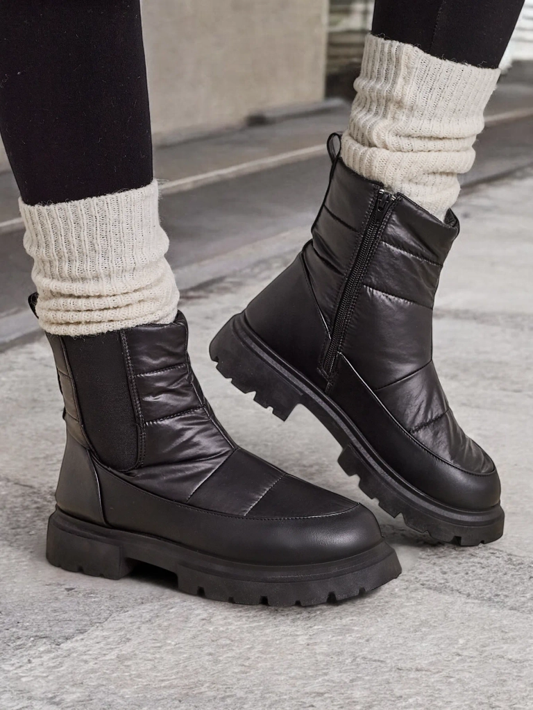 - Damen Schneestiefel mit einem Schaft aus einer Kombination von Stoff und Kunstleder. Innen angenehmes Fell, Schuhe mit einem Reißverschluss verschließbar. Perfekt für den Winter!