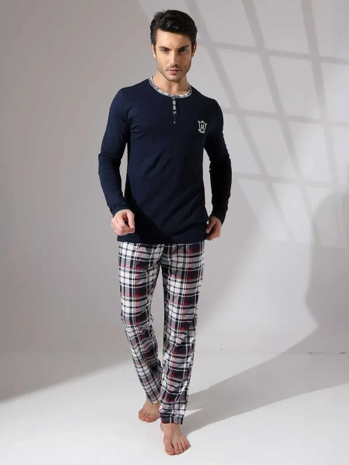 - Eleganter Herrenpyjama mit einzigartigem Print und karierten Hosen. Aus hochwertiger Baumwolle gefertigt, garantiert er einen angenehmen Schlaf und ein stilvolles Aussehen. ACHTUNG: Messgenauigkeit (+/-) 1 cm.