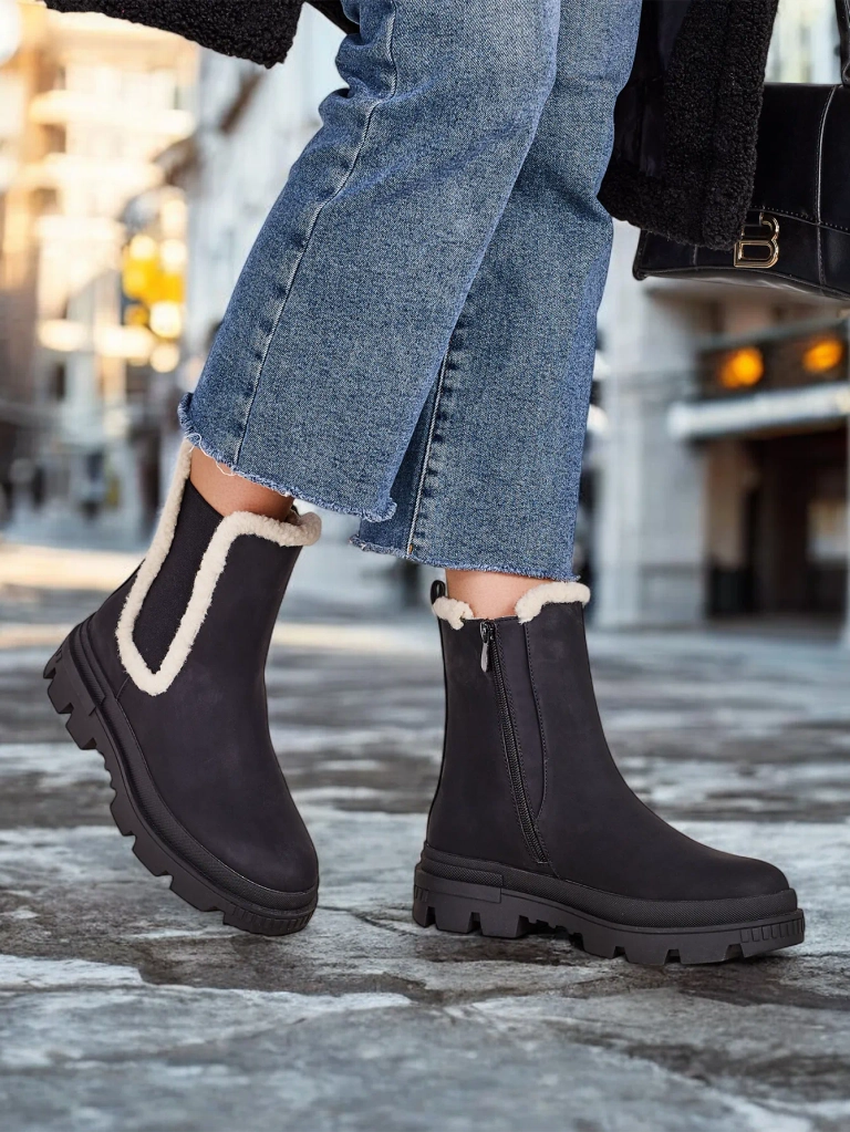 • Super stylische Damenstiefel mit dekorativem Fellfutter. Hergestellt aus mattem Kunstleder. Die dickere Sohle sorgt für Komfort bei jedem Schritt. Tolle Wahl für den Herbst!