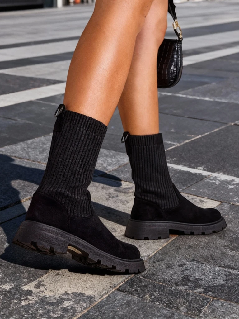 • Fantastische flache Damen-Slip-On-Stiefel aus Wildleder-ähnlichem Eco-Leder und Stoff. Das Stofffutter sorgt auch an kälteren Tagen für Komfort und Wärme. Die elastischen Einsätze an den Seiten sorgen für eine perfekte Passform!