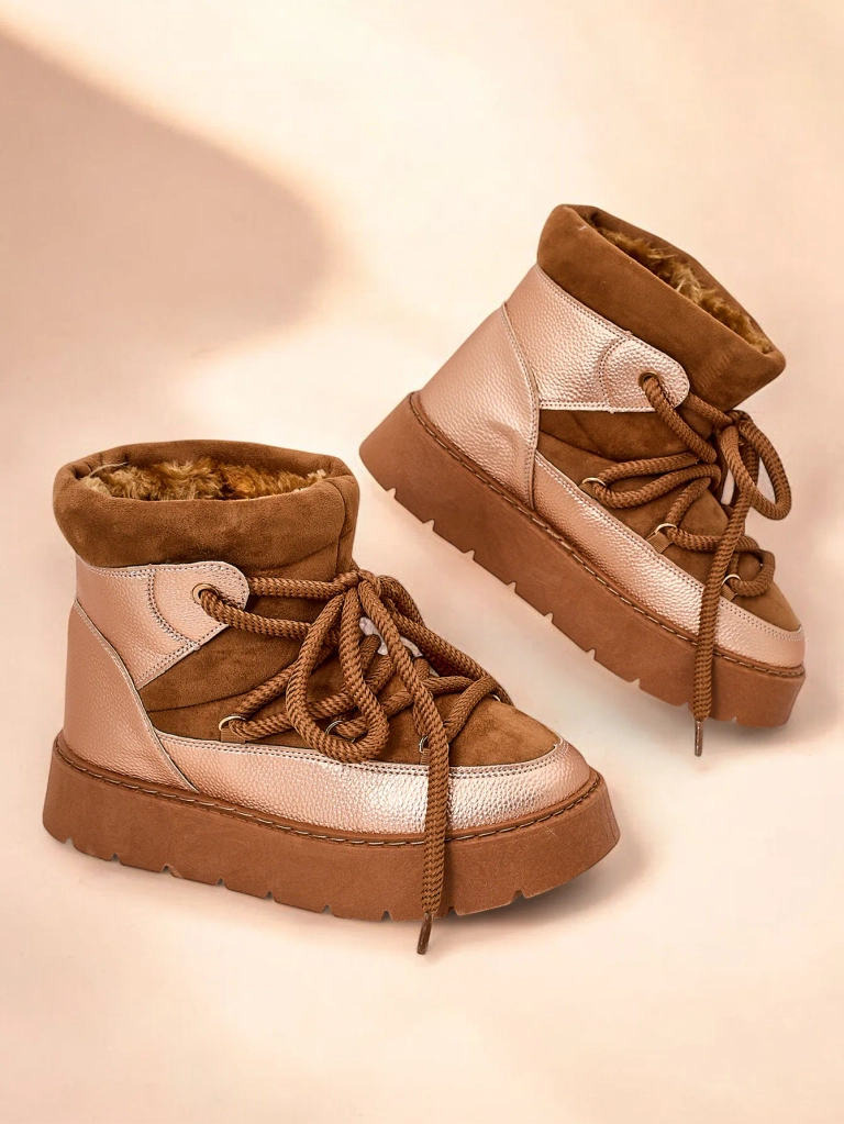 - Damen Schneestiefel mit einem Schaft aus einer Kombination von Eco-Leder und Eco-Wildleder. Innen angenehmes Fell, Slip-On- und Schnürschuhe. Perfekt für den Winter!