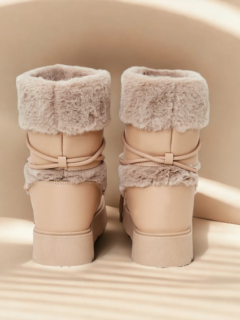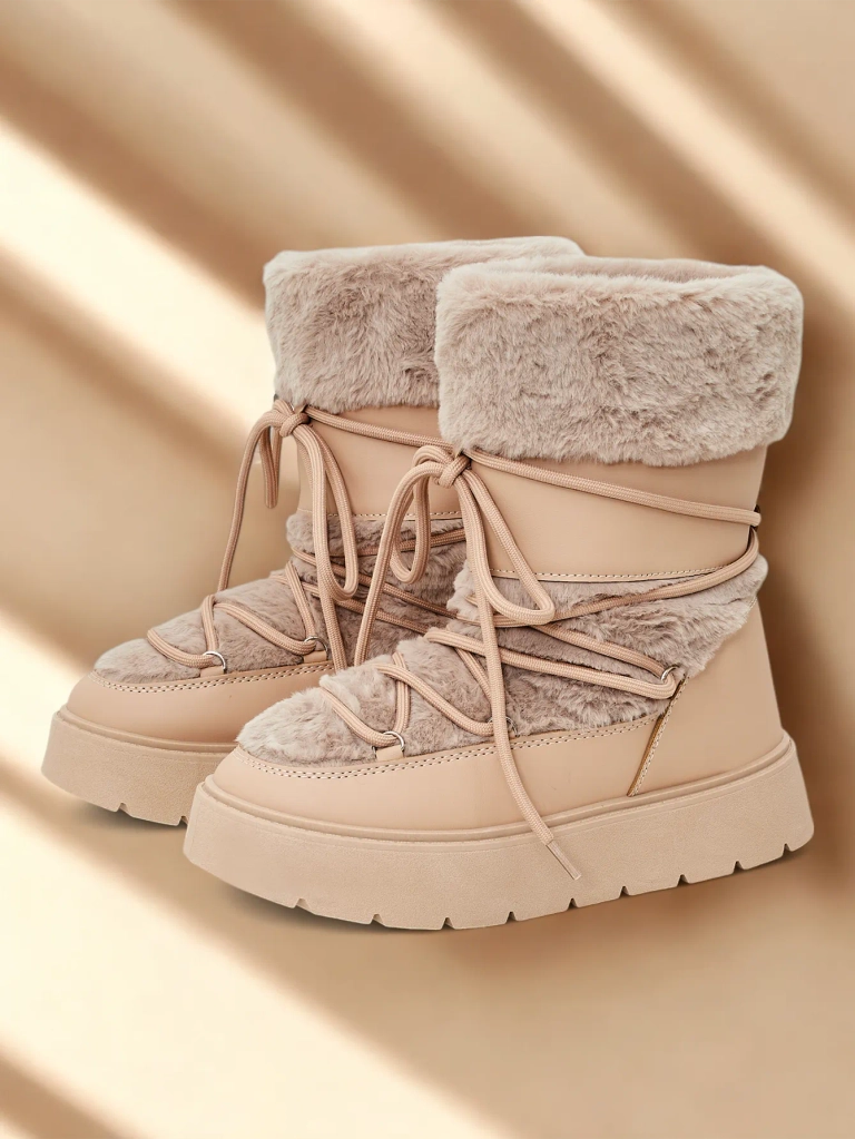 • Damen Schneeschuhe mit Schaft aus einer Kombination aus Kunstleder und angenehmem Stoff. Innen befindet sich ein angenehmes Fellfutter, der Schuh hat einen Schnürschaft. Perfekt für den Winter!