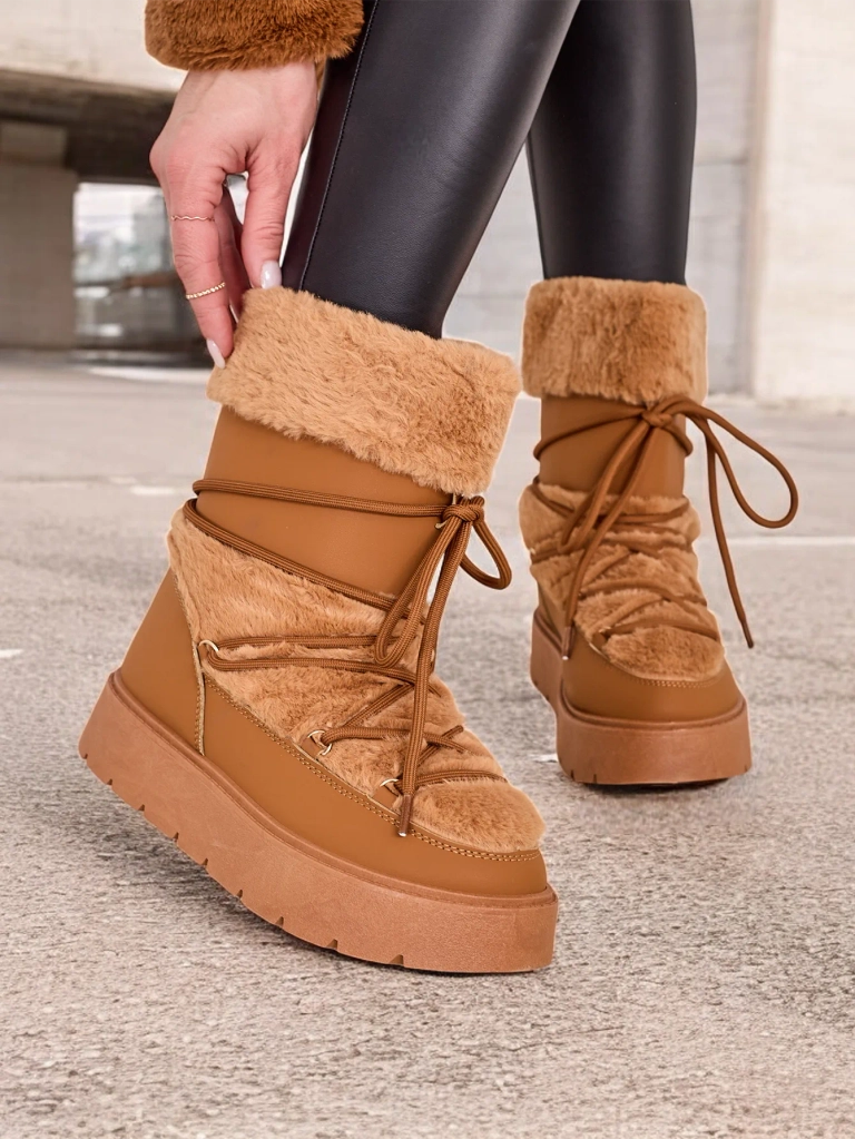 - Damen Schneeschuhe mit Schaft aus einer Kombination aus Kunstleder und angenehmem Stoff. Innen befindet sich ein angenehmes Fellfutter, der Schuh hat einen Schnürschaft. Perfekt für den Winter!