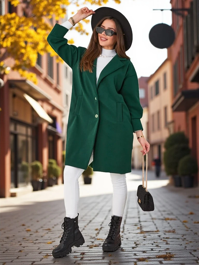 - Damenmantel aus angenehmem Material. Das Modell hat lange Ärmel und einen Knopfverschluss. Es hat ein Futter. Ein idealer Vorschlag für den Herbst! HINWEIS: Messgenauigkeit (+/-) 1 cm. Abmessungen flach gemessen.
