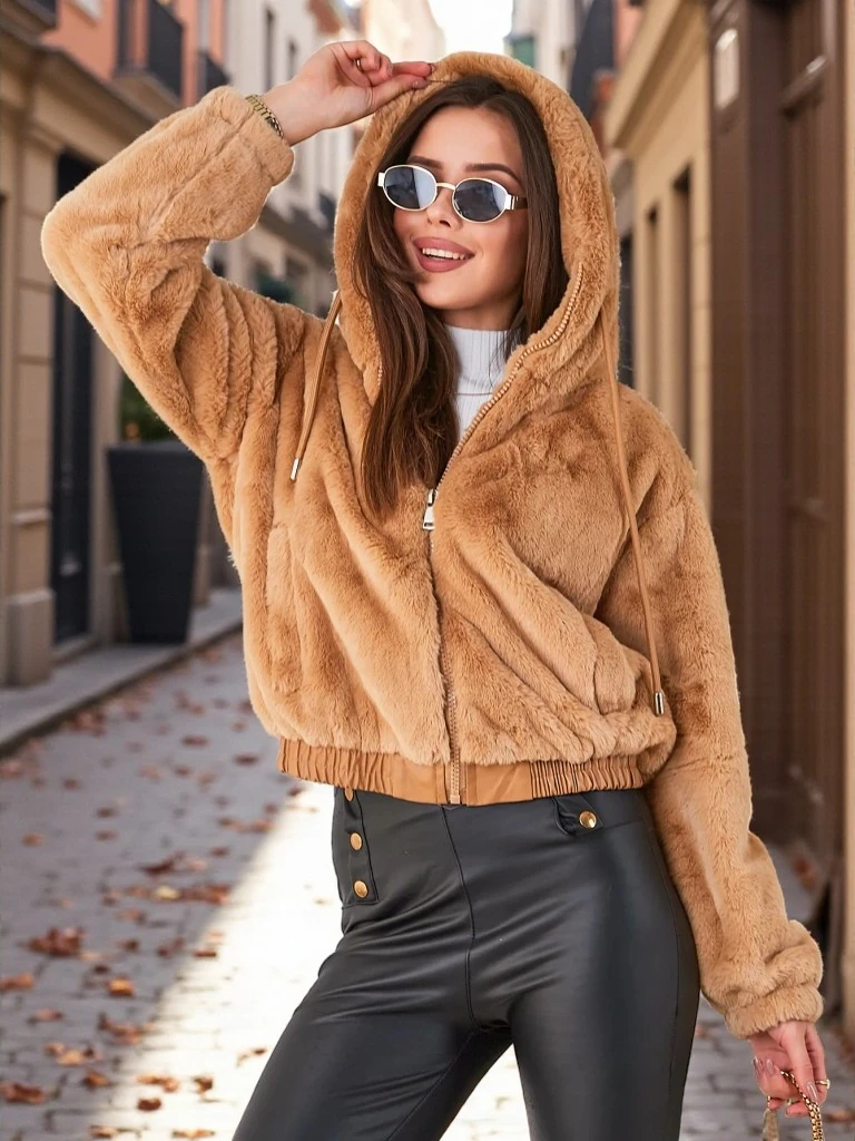 - Einzigartige Damenjacke aus angenehmem, weichem Material, das wie Pelz aussieht. Das Modell hat eine Kapuze, 2 Taschen und einen Reißverschluss. Der Hit dieser Saison!