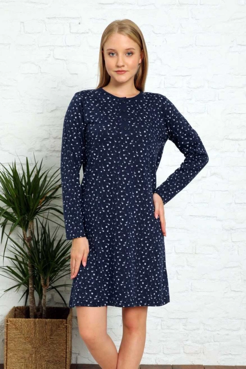 - Damen Nachthemd aus 100% weicher Baumwolle. Das Modell hat einen leicht ausgestellten Schnitt. Es hat einen runden Halsausschnitt, lange Ärmel und einen dekorativen Druck. HINWEIS: Messgenauigkeit (+/-) 1 cm.