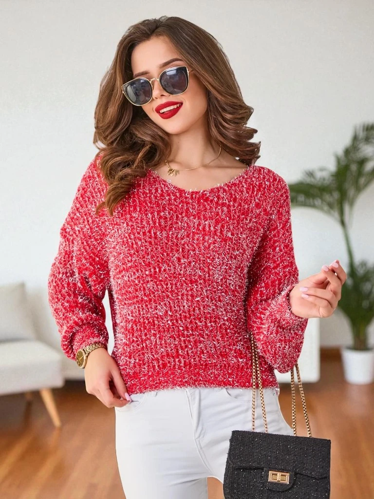 - Dieser stilvolle Pullover verkörpert Komfort und Charme. Hergestellt aus weichem Material, hat der Pullover einen V-Ausschnitt und lange Ärmel. Der lockere Schnitt und der glänzende Faden verleihen ihm einen einzigartigen Charme!