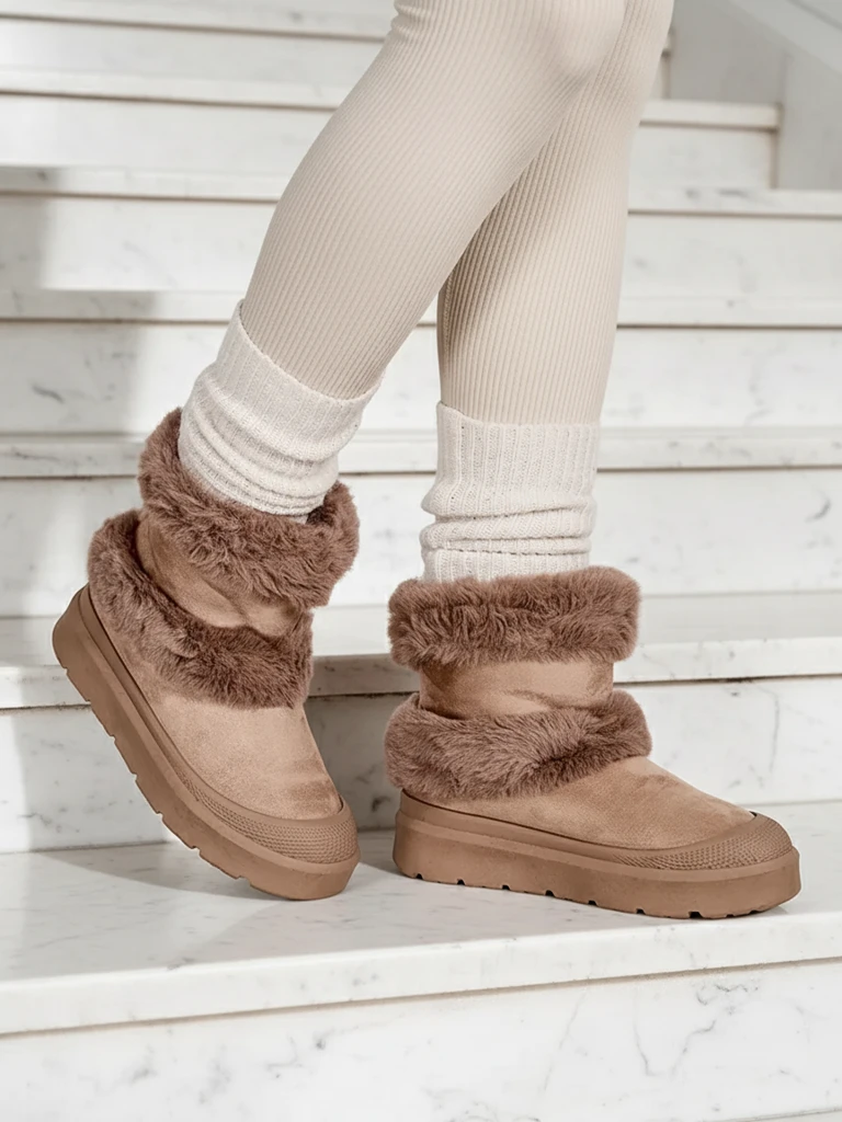 - Damen-Schneestiefel mit einem Schaft aus einer Kombination von Wildleder-Eco-Leder und angenehmem Stoff. Innen gibt es ein angenehmes Pelzfutter. Perfekt für den Winter!