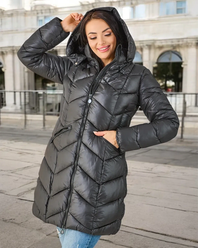 • Warme knielange Winterjacke für Damen mit abnehmbarem Kapuzen. Steppmodell, hat 2 Reißverschlusstaschen und einen Reißverschluss. Die Jacke ist innen mit Fell gefüttert und hat eine Synthesefüllung. Ideal für kühlere Tage!
