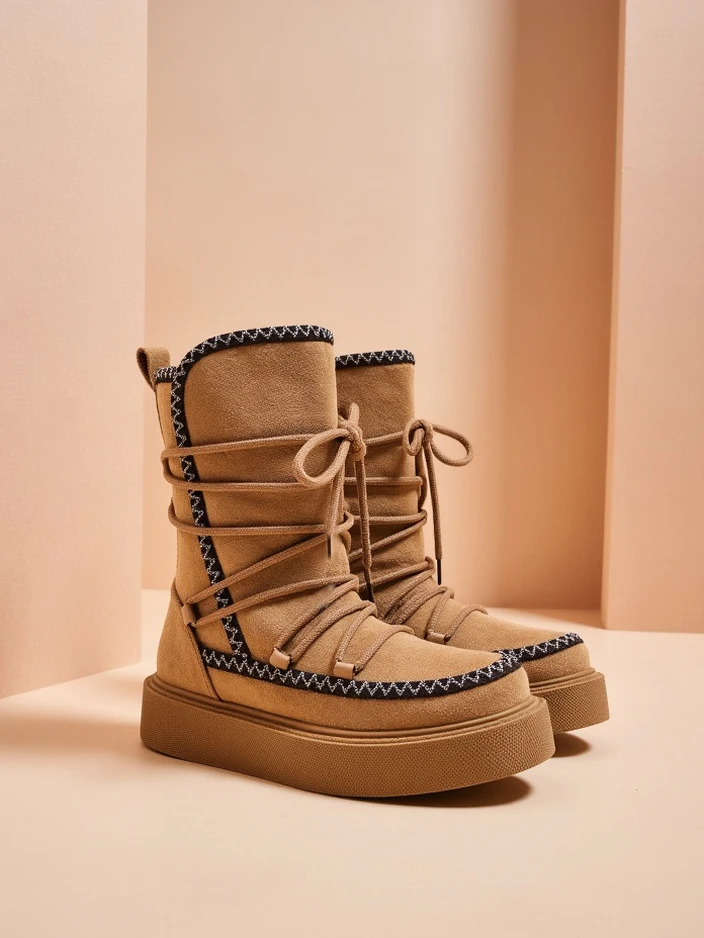 - Damen Schneestiefel mit einem Schaft aus Wildleder-Ökoleder. Innen befindet sich eine zarte Isolierung, und die Schuhe sind geschnürt. Perfekt für den Winter!