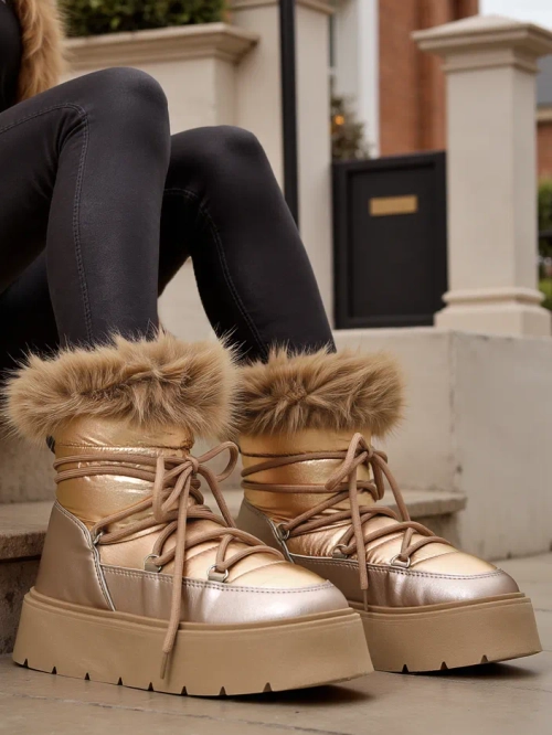 - Damen Schneestiefel mit einem Obermaterial aus einer Kombination von einer ölzeugähnlichen Stoff und ökologischem Leder. Innen gibt es ein angenehmes Futter, die Schuhe sind zum Hineinschlüpfen und mit Schnürung. Perfekt für den Winter!