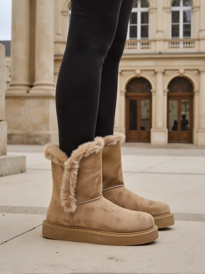 - Ausgezeichnete Damen Winter Schneestiefel auf einer flachen Plattform. Das Obermaterial besteht aus Kunstwildleder, und die Innenseite ist mit Fleece gefüttert. Eine ideale Basis für den Winter!