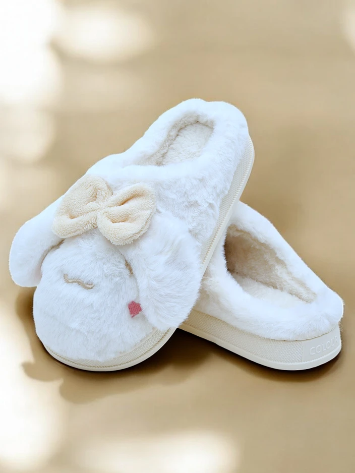 - Unglaubliche Damenpantoletten mit flacher Sohle, verziert mit einer Schleife. Das Modell besteht aus Materialien, die Fell imitieren. Eine großartige Option für Hausschuhe!