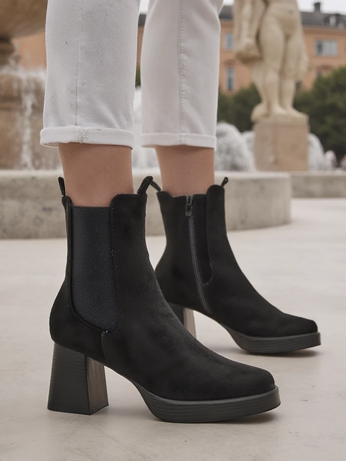 - Stylische Damen Stiefeletten aus ökologischem Suede - die perfekte Lösung für kühlere Tage. Die Schuhe verfügen über einen Reißverschluss und haben eine Innensohle aus ökologischem Leder. Modell mit dekorativem Blockabsatz und quadratförmiger Zehenpartie.
