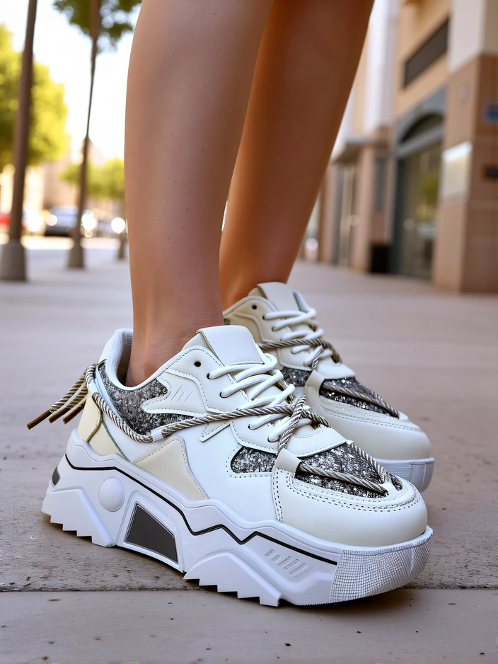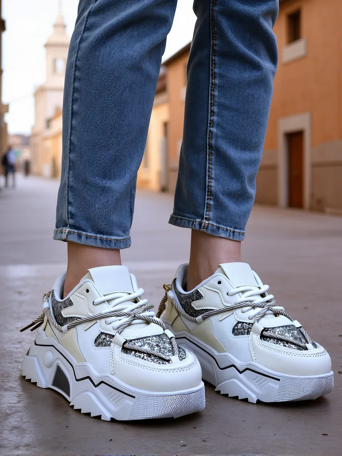 - Damen Sportschuhe im Sneaker-Stil mit dicker Sohle. Hergestellt aus Kunstleder und Stoff, zusätzlich mit einer Innensohle aus Kunstleder. Eine super Ergänzung für Ihre alltäglichen Freizeit-Outfits!